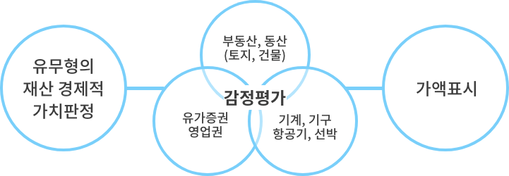 감정평가부동산, 동산(토지, 건물) 유가증권영업권 기계, 기구,항공기, 선박